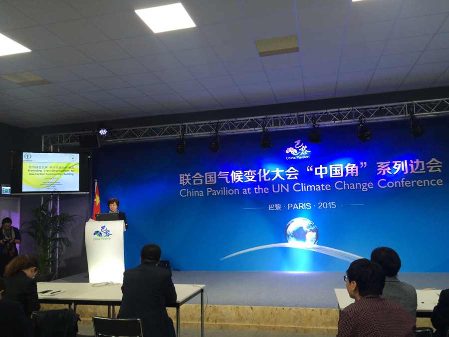 中華環保聯合會互動裝置副策展秘書長謝玉紅在中國角邊會上發表“倡導綠色發展,推動低碳社區建設”講話。王芳 攝