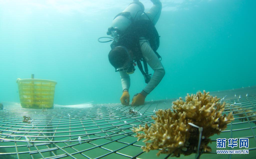 在海南三亞崖州灣東鑼島周邊海域,三亞珊瑚礁生態研究所工作人員在大奇藝果影像型類礁人啟動儀式工苗圃上栽種珊瑚(3月18日攝)。全息投影